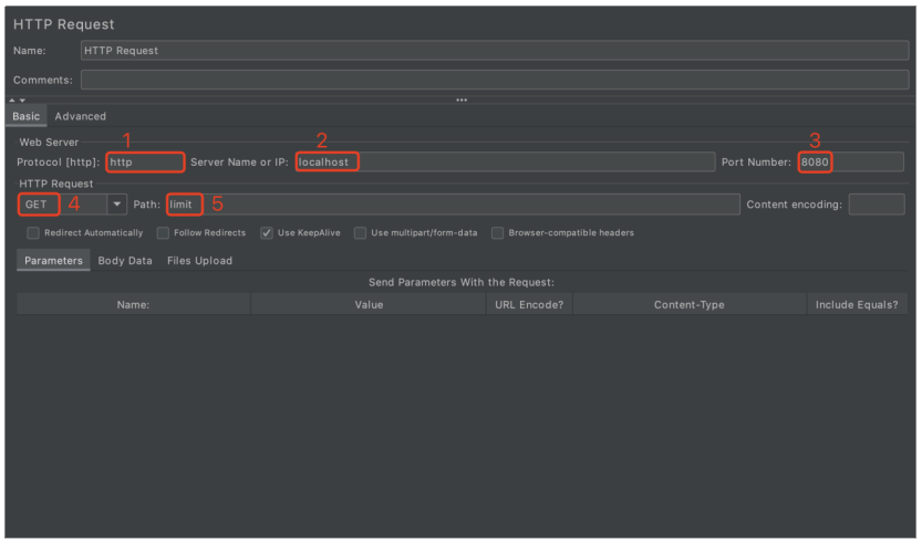 「HTTP Request」界面中填入如下信息,和之前的Controller对应: