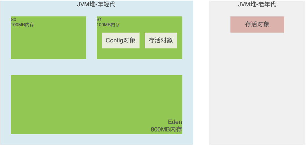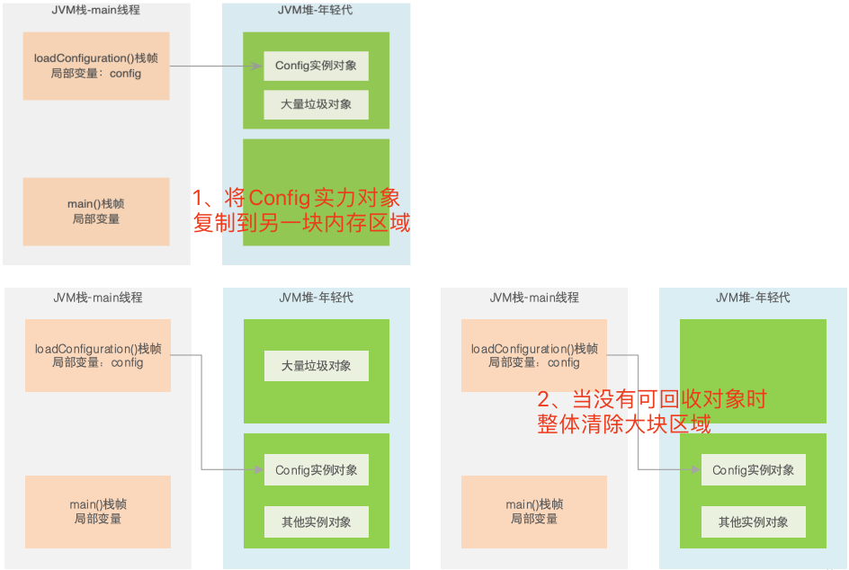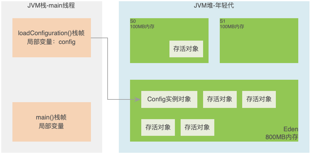 年轻代的内存被分为两部分,其中一块创建对象实例,供栈中的局部变量引用。当空间不足时,就可能触发年轻代的垃圾回收: