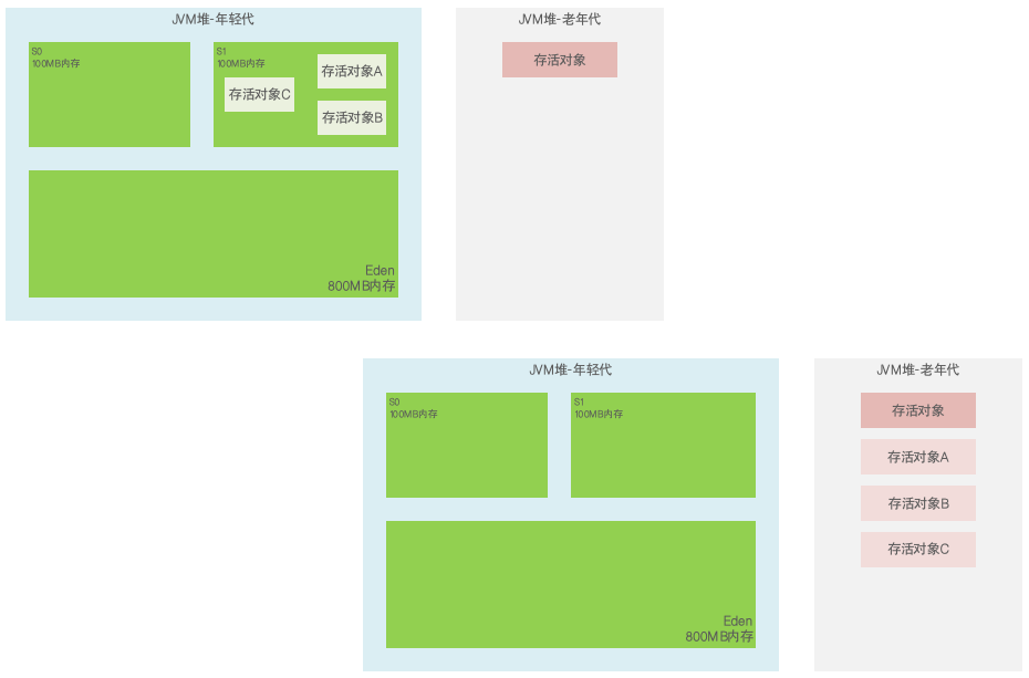 1、Minor GC时,Eden中的存活对象会一次性转移到另一块空闲的Survivor区中区(比如S1);
