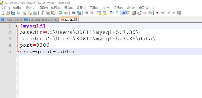7.最后编辑my.ini文件,删除或者注释掉最后一行,重启mysql即可正常使用。