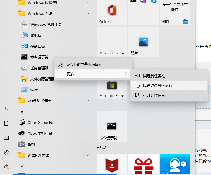 5.启动管理员模式的cmd窗口,注意是管理员模式,win+R的cmd窗口的是普通模式,再开始的菜单栏中找到windowd系统->命令提示符,然后以管理员的身份运行,