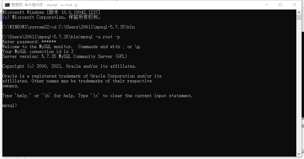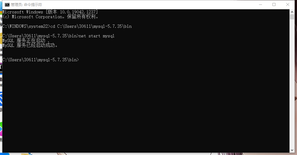 6.连接数据库,切换到bin目录下,输入net start mysql,即可连接;