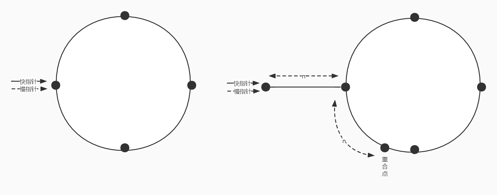 像左图那样在一个环形链表定义两个指针,一个快指针一个慢指针,在一个位置出发,那么肯定还会在这个位置相遇,如果说我要是像右图那样,起点提前了n个节点,那么相遇的位置也会离上次相遇的位置距离n个节点,这个时候我要是把慢指针放到开始的位置上,并且快指针的速度也和慢指针一样,那么他们肯定会在环的入环位置相遇。