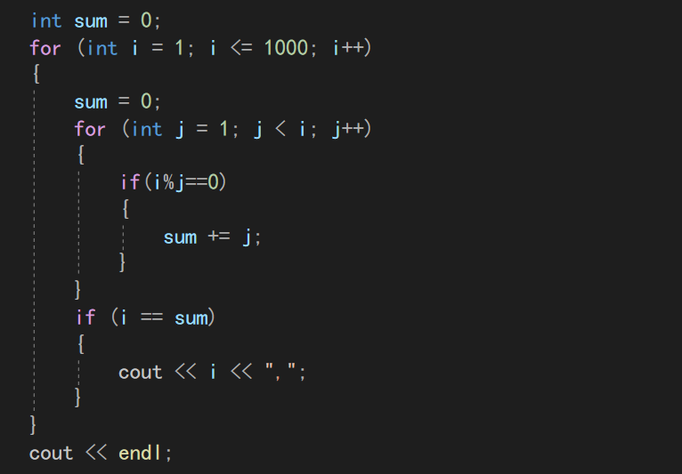 4.计算1000内的完数。完数:一个数恰好等于他的真因子之和,则称之为完数。真因子:除了自身以外的约数