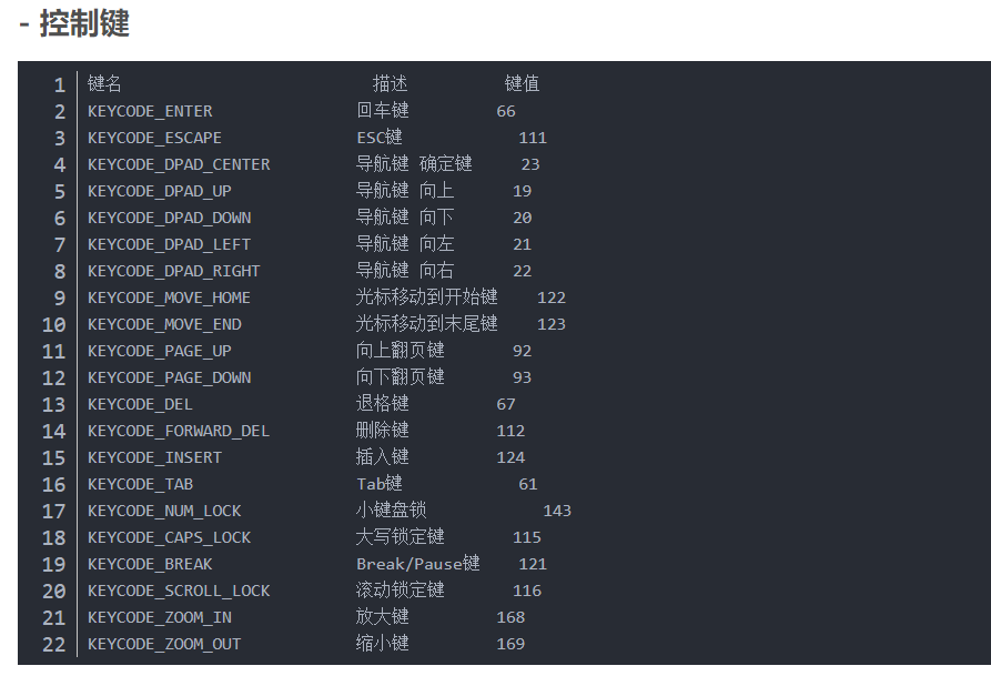 键名 描述 键值 KEYCODE_0 按键'0' 7 KEYCODE_1 按键'1' 8 KEYCODE_2 按键'2' 9 KEYCODE_3 按键'3' 10 KEYCODE_4 按键'4' 11 KEYCODE_5 按键'5' 12 KEYCODE_6 按键'6' 13 KEYCODE_7 按键'7' 14 KEYCODE_8 按键'8' 15 KEYCODE_9 按键'9' 16 KEYCODE_A 按键'A' 29 KEYCODE_B 按键'B' 30 KEYCODE_C 按键'C' 31 KEYCODE_D 按键'D' 32 KEYCODE_E 按键'E' 33 KEYCODE_F 按键'F' 34 KEYCODE_G 按键'G' 35 KEYCODE_H 按键'H' 36 KEYCODE_I 按键'I' 37 KEYCODE_J 按键'J' 38 KEYCODE_K 按键'K' 39 KEYCODE_L 按键'L' 40 KEYCODE_M 按键'M' 41 KEYCODE_N 按键'N' 42 KEYCODE_O 按键'O' 43 KEYCODE_P 按键'P' 44 KEYCODE_Q 按键'Q' 45 KEYCODE_R 按键'R' 46 KEYCODE_S 按键'S' 47 KEYCODE_T 按键'T' 48 KEYCODE_U 按键'U' 49 KEYCODE_V 按键'V' 50 KEYCODE_W 按键'W' 51 KEYCODE_X 按键'X' 52 KEYCODE_Y 按键'Y' 53 KEYCODE_Z 按键'Z' 54