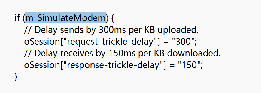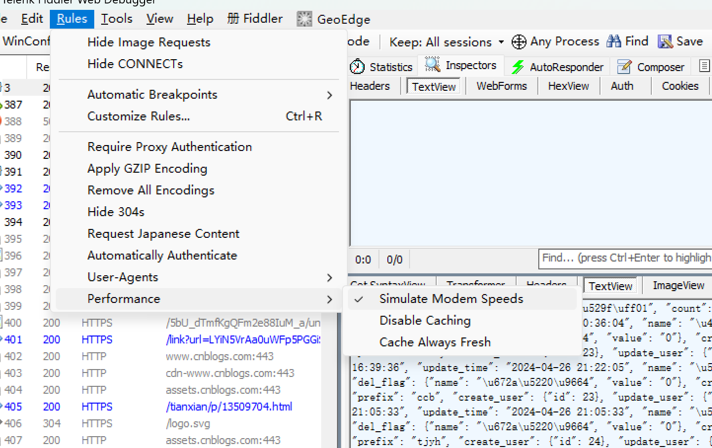 1、启动弱网,Rules→Performance→勾选Simulate Modem Speed,勾选之后你会发现网络速度已经慢下来了,因为系统里有预设的网络参数值。