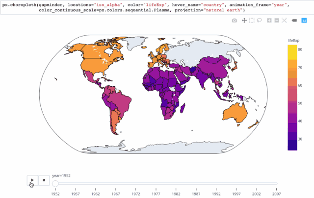 也许你不仅仅对 2007年 感兴趣,而且你想看看这张图表是如何随着时间的推移而演变的。可以通过设置 animation_frame="year" (以及 animation_group ="country" 来标识哪些圆与控制条中的年份匹配)来设置动画。