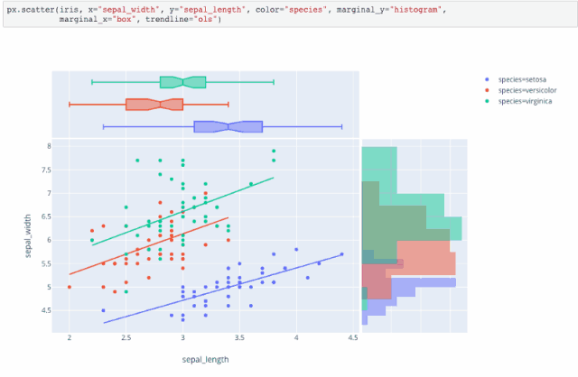 还可以创建联合分布图(marginal rugs),使用直方图,箱形图(box)或小提琴来显示双变量分布,也可以添加趋势线。Plotly Express 甚至可以帮助你在悬停框中添加线条公式和R²值! 它使用 statsmodels 进行普通最小二乘(OLS)回归或局部加权散点图平滑(LOWESS)。