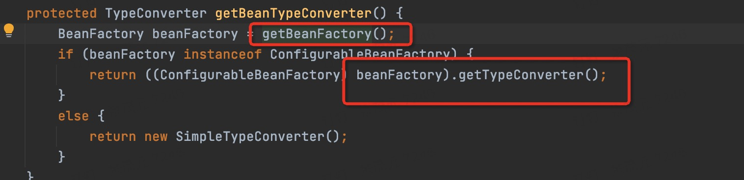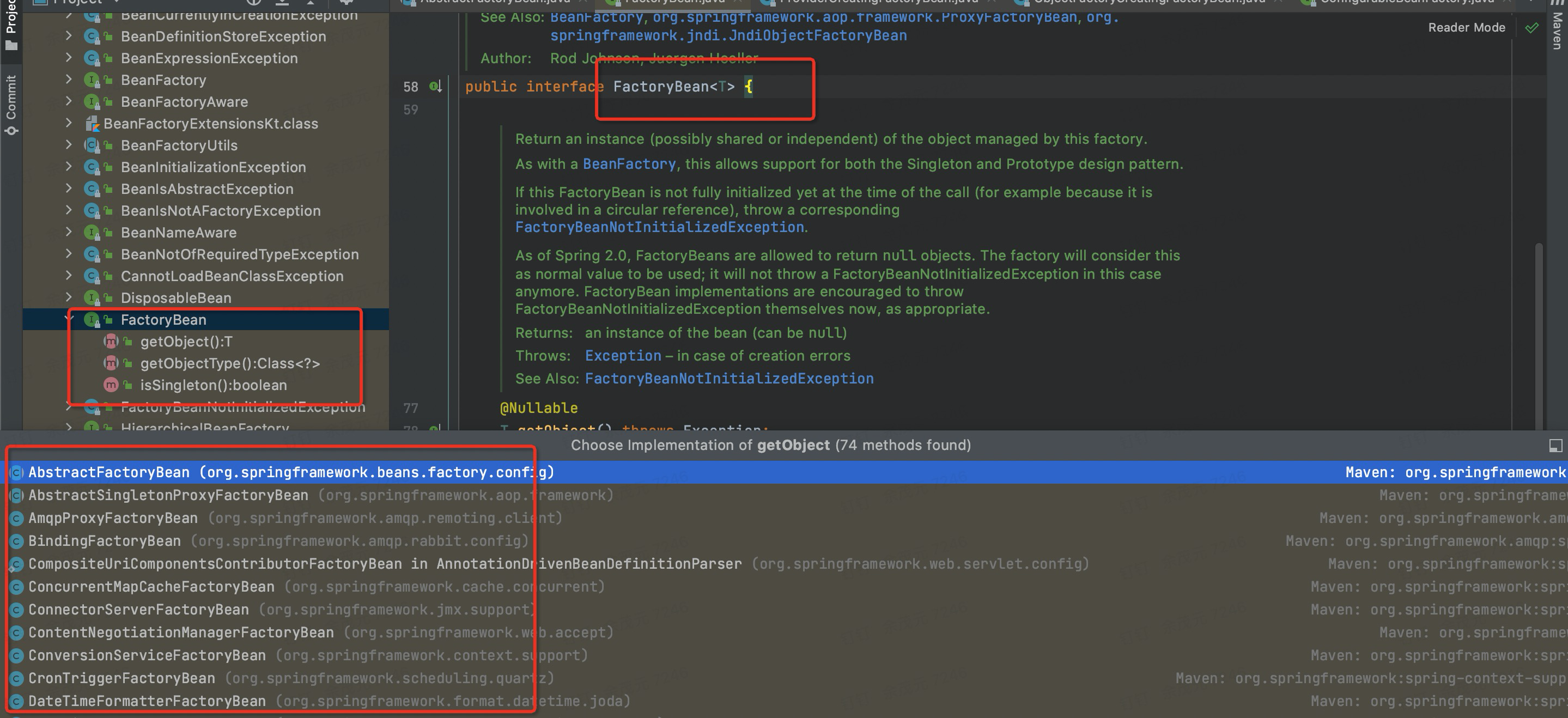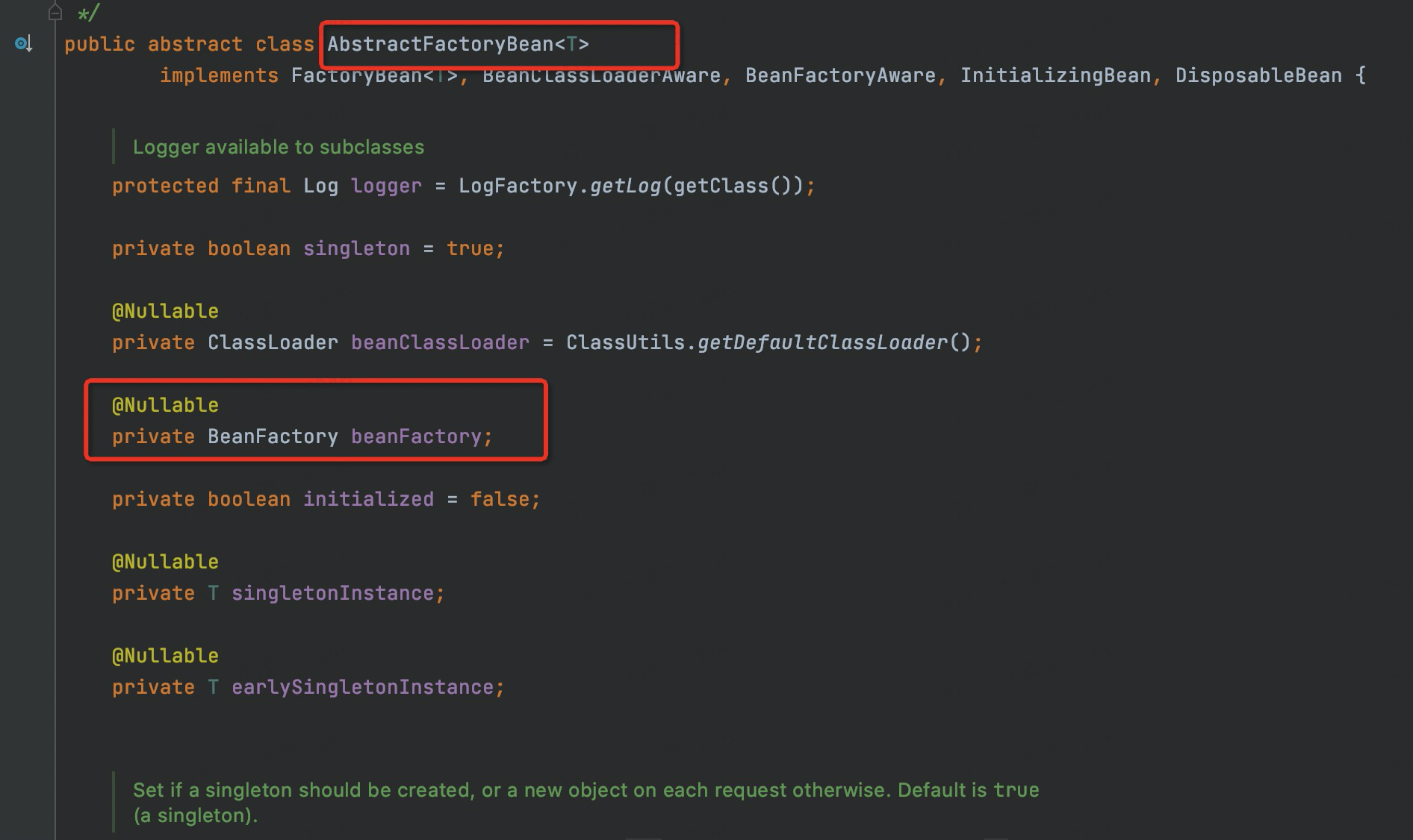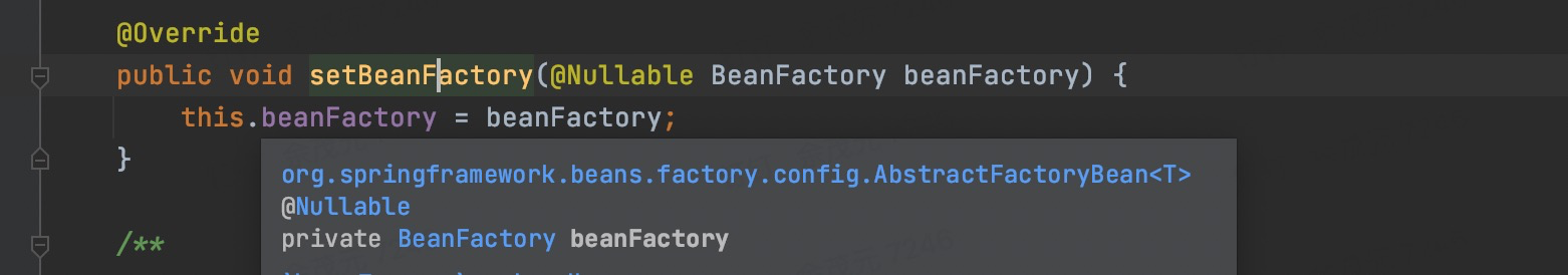 上图AbstractFactoryBean就是FactoryBean的一个抽象类实现,可以看到其具有BeanFactory的引用 通过setBeanFactory获得对应工厂类实例,再通过getBeanFactory使用这个实例类实例获取FactoryBean的实现