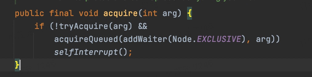 在第一个线程还在执行的时候,第二个线程threadB进入,CAS不成功,进入acquire(1)方法: