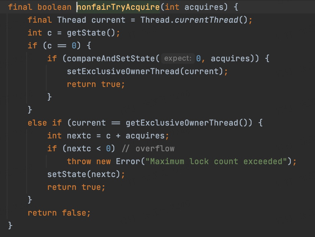 这段代码同时也解释了可重入锁,因为真是场景,多线程时间的访问是抢夺cpu时间片,说直白了就说随机的,所以存在current == getExclusiveOwnerThread()为true的情况,这时候不需要在进行锁竞争,直接在state上做累加即可,这就是可重入,同一个线程,锁资源由当前线程继续持有