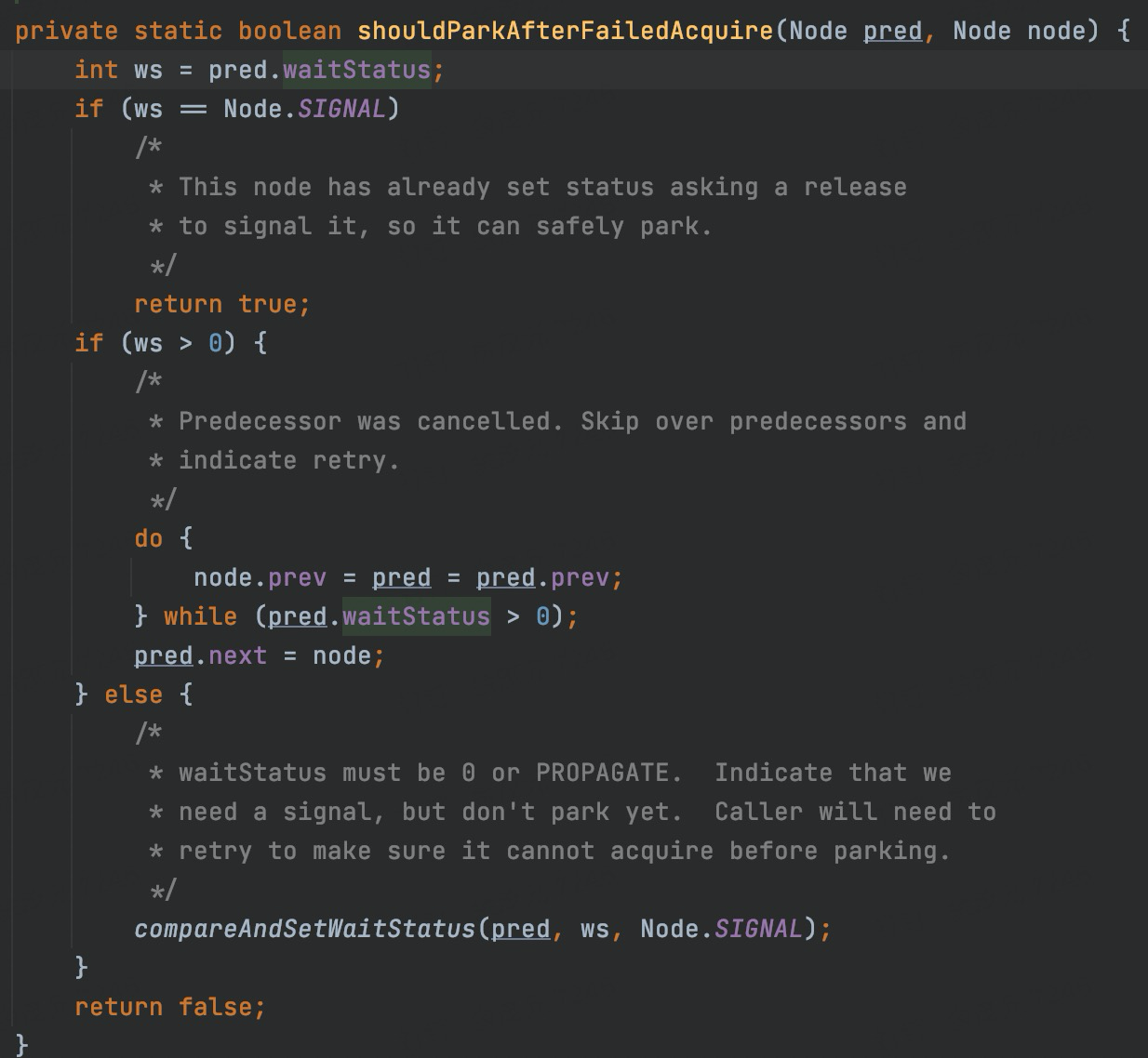 shouldParkAfterFailedAcquire返回了false,进入自旋,在进入shouldParkAfterFailedAcquire方法时,已经满足第一个条件,返回true,