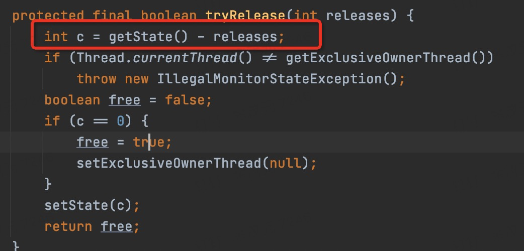 标记处处理了可重入锁的情况,释放锁资源,就是做了两件事情,当前线程设为null,state值设为0