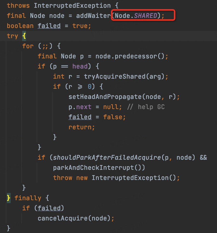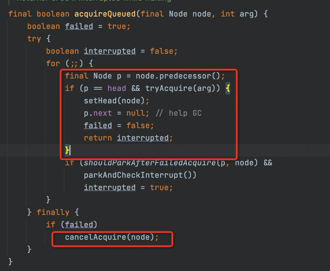 注:两个标记处,一个自旋的获取,还有一个是节点的取消