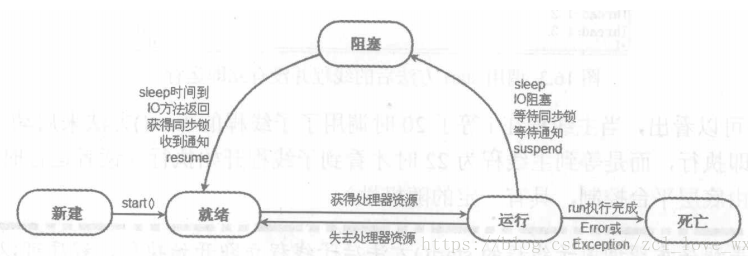 阻塞:在运行时因为其他原因,如sleep,wait将线程阻塞,只有等待唤醒并且重新获得cpu分配资源才能运行,阻塞和运行之间隔了一个就绪