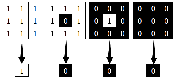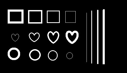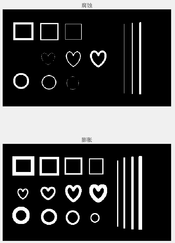 可以看到,腐蚀后,最细的白色线条消失了,其他图案也都变得更细了,而膨胀后所有白色线条都变粗了。