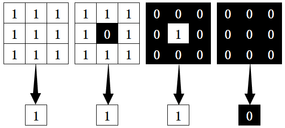 //========================================================================== //== 腐蚀,耗费2clk //========================================================================== //clk1,三行各自相与 //--------------------------------------------------- always @ (posedge clk or negedge rst_n)begin if(!rst_n)begin erode_1 <= 'd0; erode_2 <= 'd0; erode_3 <= 'd0; end else begin erode_1 <= matrix_11 && matrix_12 && matrix_13; erode_2 <= matrix_21 && matrix_22 && matrix_23; erode_3 <= matrix_31 && matrix_32 && matrix_33; end end //clk2,全部相与 //--------------------------------------------------- always @(posedge clk or negedge rst_n)begin if(!rst_n)begin erode <= 'd0; end else begin erode <= erode_1 && erode_2 && erode_3; end end //========================================================================== //== 腐蚀后的数据 //========================================================================== assign erode_data = erode ? 16'hffff : 16'h0000;