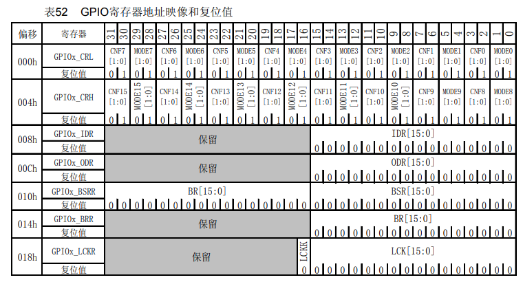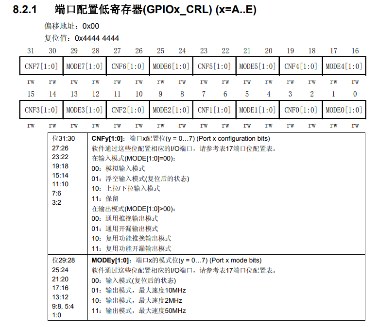 GPIO的每个引脚需要4个位来设置输入输出模式和速率,所以工作模式寄存器有两个32位的CRL和CRH,对应低8位引脚和高8位引脚;