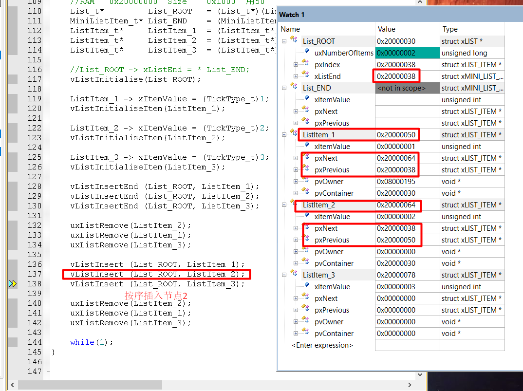 pxIndex->pxPrevious->pxNext = pxNewListItem; //操作连接点