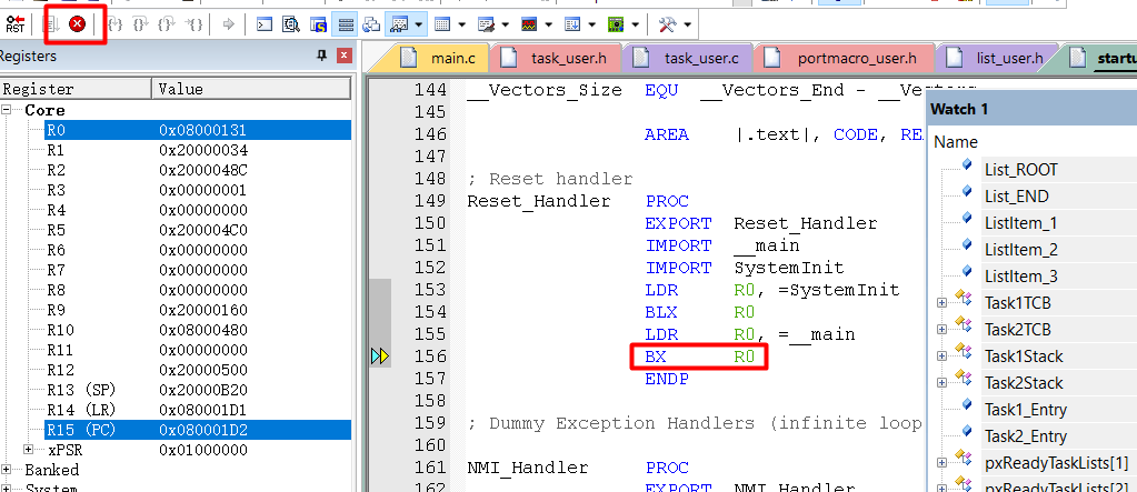 这次都没打断点,所以复位单片机后,重新烧写,进入在线调试,发现没问题。