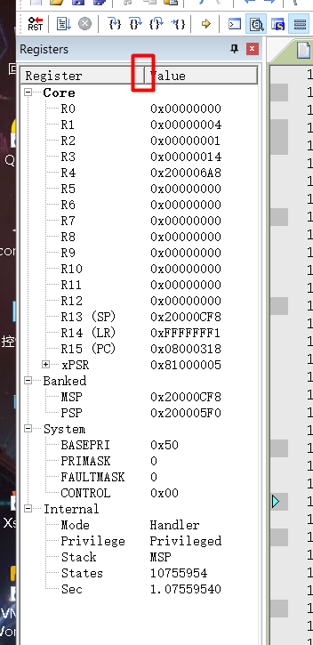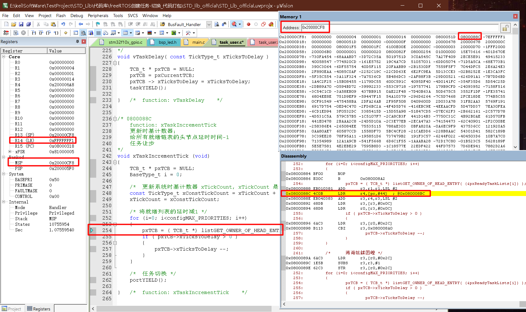 0xFFFFFFF1 表示中断返回时从MSP堆栈恢复寄存器值,中断返回后进入Handler模式,使用MSP堆栈,(相当于从中断返回到另一个中断)。