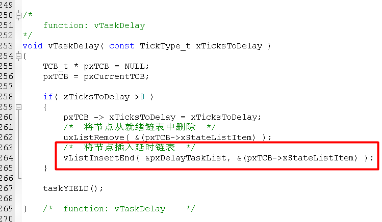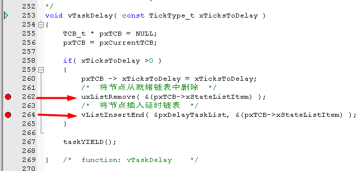 再次修改延时函数TaskDelay,把被延时的任务从就绪链表中移除: