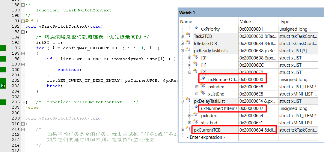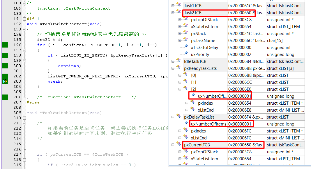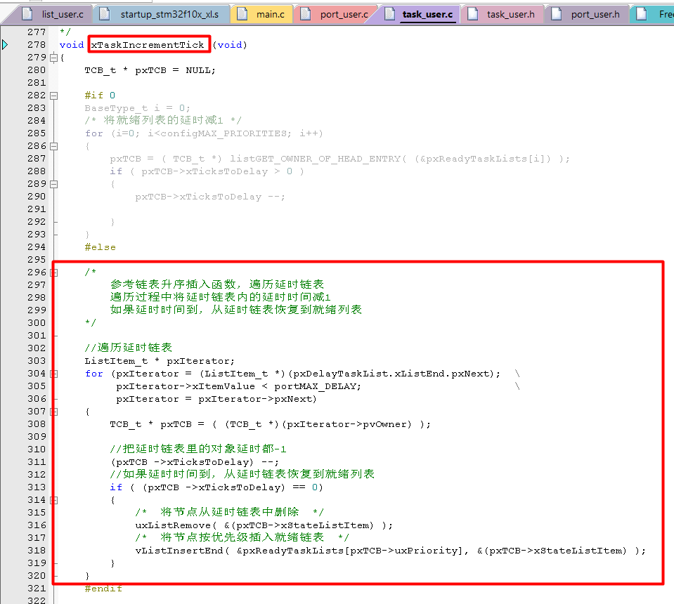 这里离实际完成还有一部分,这部分后面实现;(任务延时之后,要把它移出就绪列表,时间到了再添加回去,因为我们的任务切换算法是从就绪任务列表搜索的)