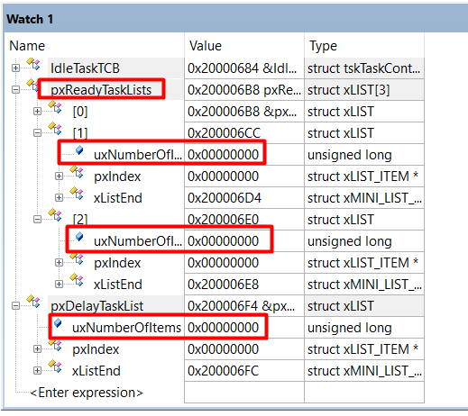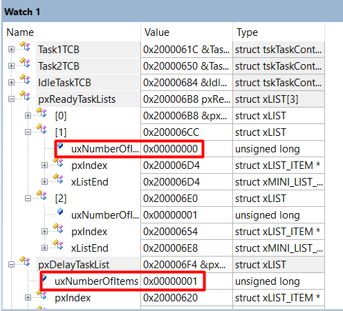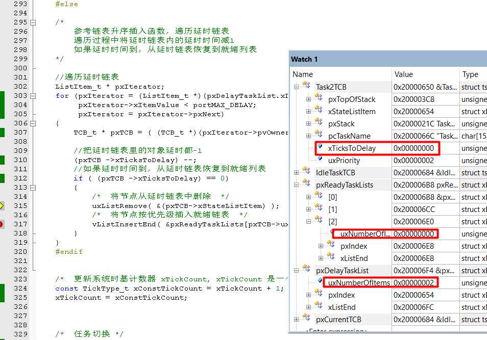 11.尝试调试,观察任务延时、和任务延时结束,TCB所在的链表是否改变: