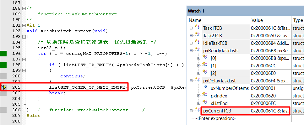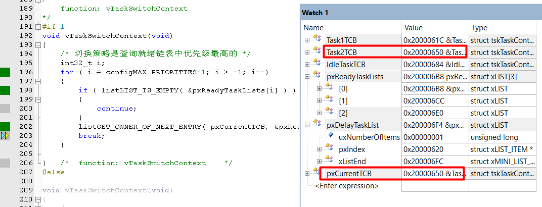 就绪后,任务2成功从延时链表恢复到就绪链表,并且CurrentTCB 为任务2:
