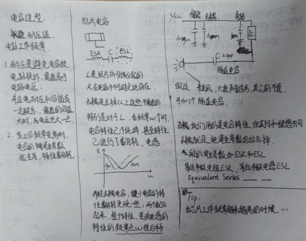 还会靠近芯片放一个更小的电容,旁路电容。它既能去掉电源产生电能中的高频干扰,也能去掉芯片工作过程中对外界产生的高频干扰。