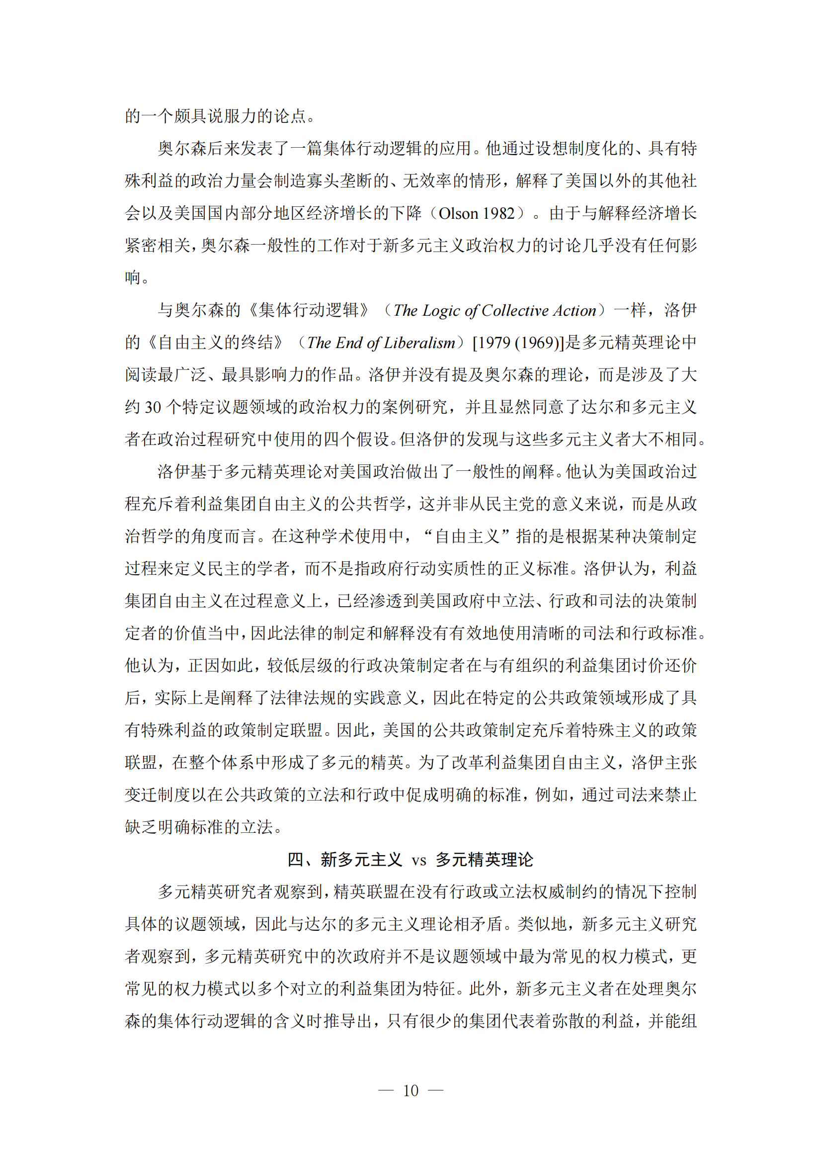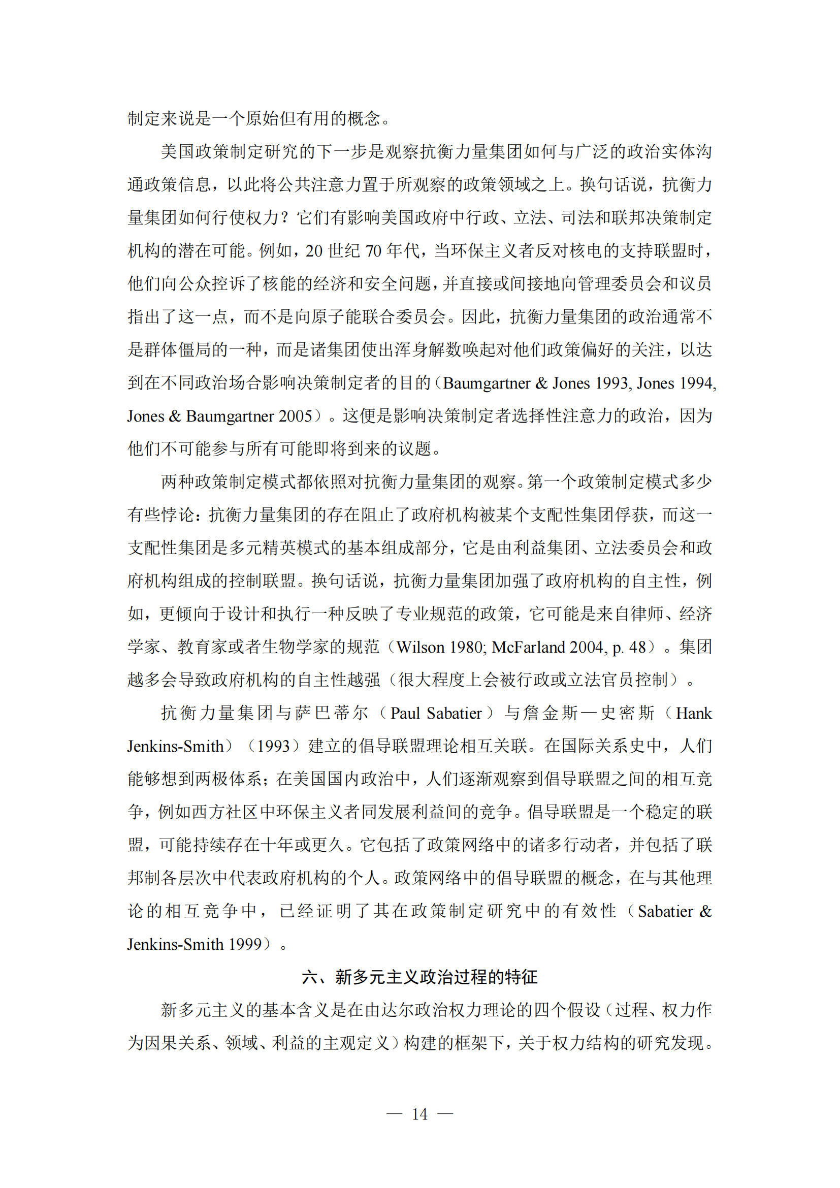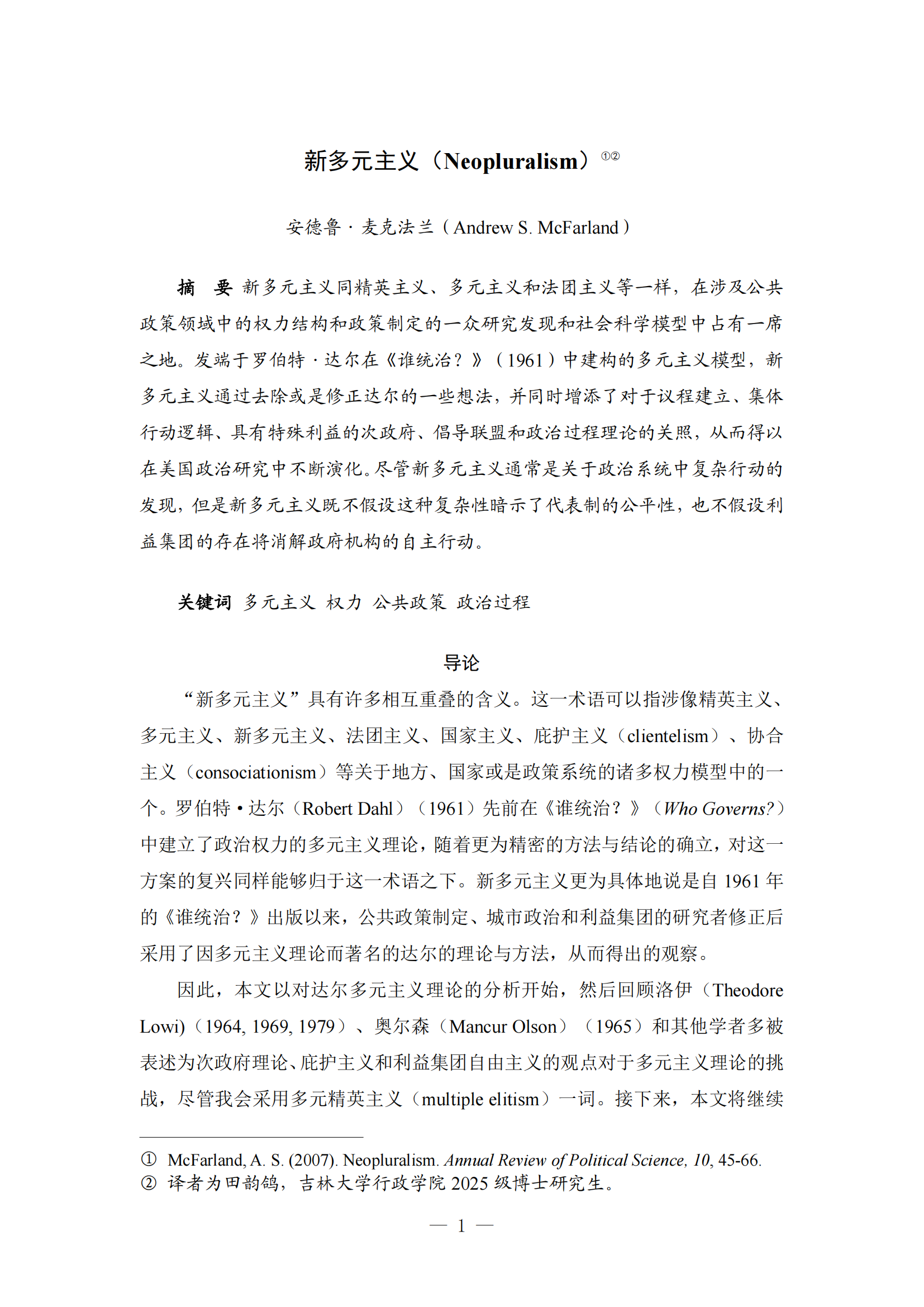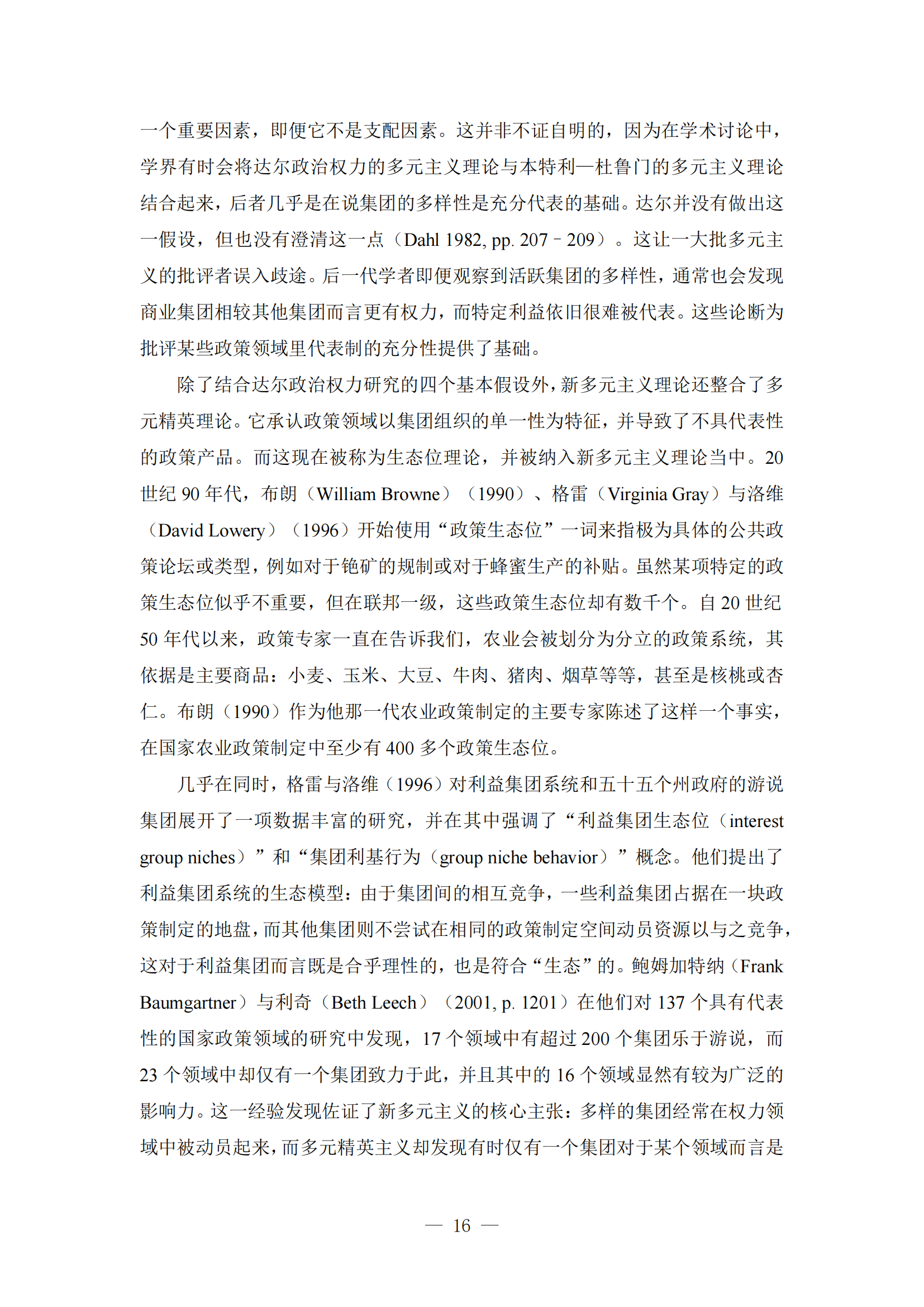 新多元主义同精英主义、多元主义和法团主义等一样,在涉及公共政策领域中的权力结构和政策制定的一众研究发现和社会科学模型中占有一席之地。发端于罗伯特·达尔在《谁统治?》(1961)中建构的多元主义模型,新多元主义通过去除或是修正达尔的一些想法,并同时增添了对于议程建立、集体行动逻辑、具有特殊利益的次政府、倡导联盟和政治过程理论的关照,从而得以在美国政治研究中不断演化。尽管新多元主义通常是关于政治系统中复杂行动的发现,但是新多元主义既不假设这种复杂性暗示了代表制的公平性,也不假设利益集团的存在将消解政府机构的自主行动。