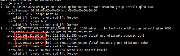 重启完成后重启虚拟机,用ip addr 查看ip地址,即为刚设置的ip