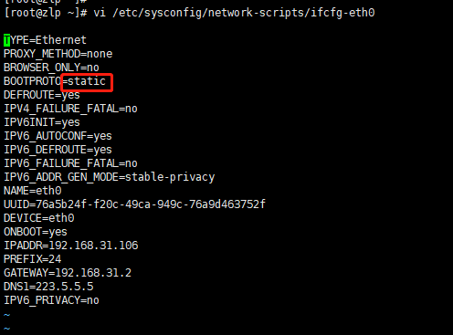 2.编辑该文件。(输入i,进入编辑状态,将BOOTPROTO的值改为static(改为静态地址),再在文件的最下边添加几个参数并赋值(值根据自己的ip地址来定义),保存文件并退出(先按esc键,再输入:wq,回车即保存退出)),如下图所示: