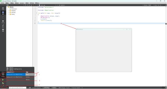在打开工程之后会得到如下图6的一个基础工程,我们点击1处选择编译器再点击2处的构建,看见界面右侧没有报错后点击3处的运行按钮如果出现4处的窗口,那么就说明工程创建成功。