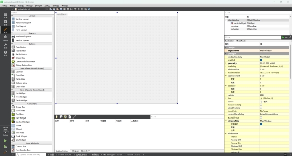双击白色界面的左侧中的 项目 视图中的Forms中的ui文件后就能够看见图7中的界面。界面的左侧是ui中能够直接使用的控件,中间的窗口能够放置控件,而右侧则是ui中所有的控件列表,在其下方黄色的部分是所选中控件的属性设置。