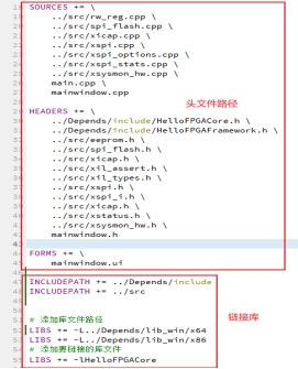 我们编写程序主要是在mainwindow.cpp中编写,如果需要添加其他的.c和.h文件则找到项目视图中的Header或者Source文件夹右键添加现有文件选择需要添加的文件,添加成功后会在项目视图中显示添加的文件,同时在.pro文件中也能看见它们的路径已经添加到项目中了。如果需要添加动态库或者静态库则需要在.pro文件中添加其路径。