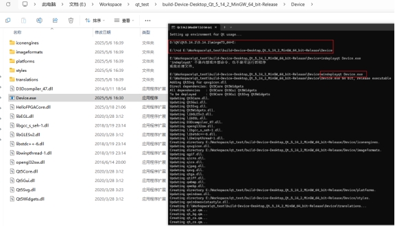 如下图,更改盘符后,使用cd指令指定到exe所在的目录,接着使用qt自带的 windeployqt 指令补全此exe文件的系统文件,打开文件夹就能够发现刚才创建的文件夹内新增了许多文件。正常来说将这个文件夹复制到其他电脑中就能够使用了,但是这样不是很美观,那么就还可以继续打包创建成单个的exe文件。