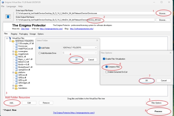 我们使用的是Enigma Virtual Box工具https://www.enigmaprotector.com/en/downloads.html 安装好后,双击打开软件,在1处选中需要打包的exe文件,接着在2处更改为自己需要的文件名称(后期也可以自己修改),接下来点击三处选择红字中的选项,选中创建的Device文件夹点击ok,然后点击 Files Options 选中Compress ,确认后点击Process就开始打包最后在与exe文件处会新增一个新生成的exe文件,此文件就能有使用了