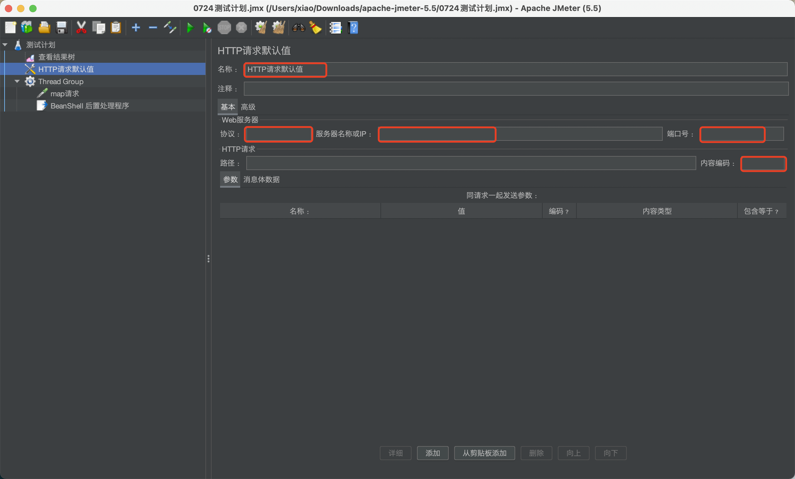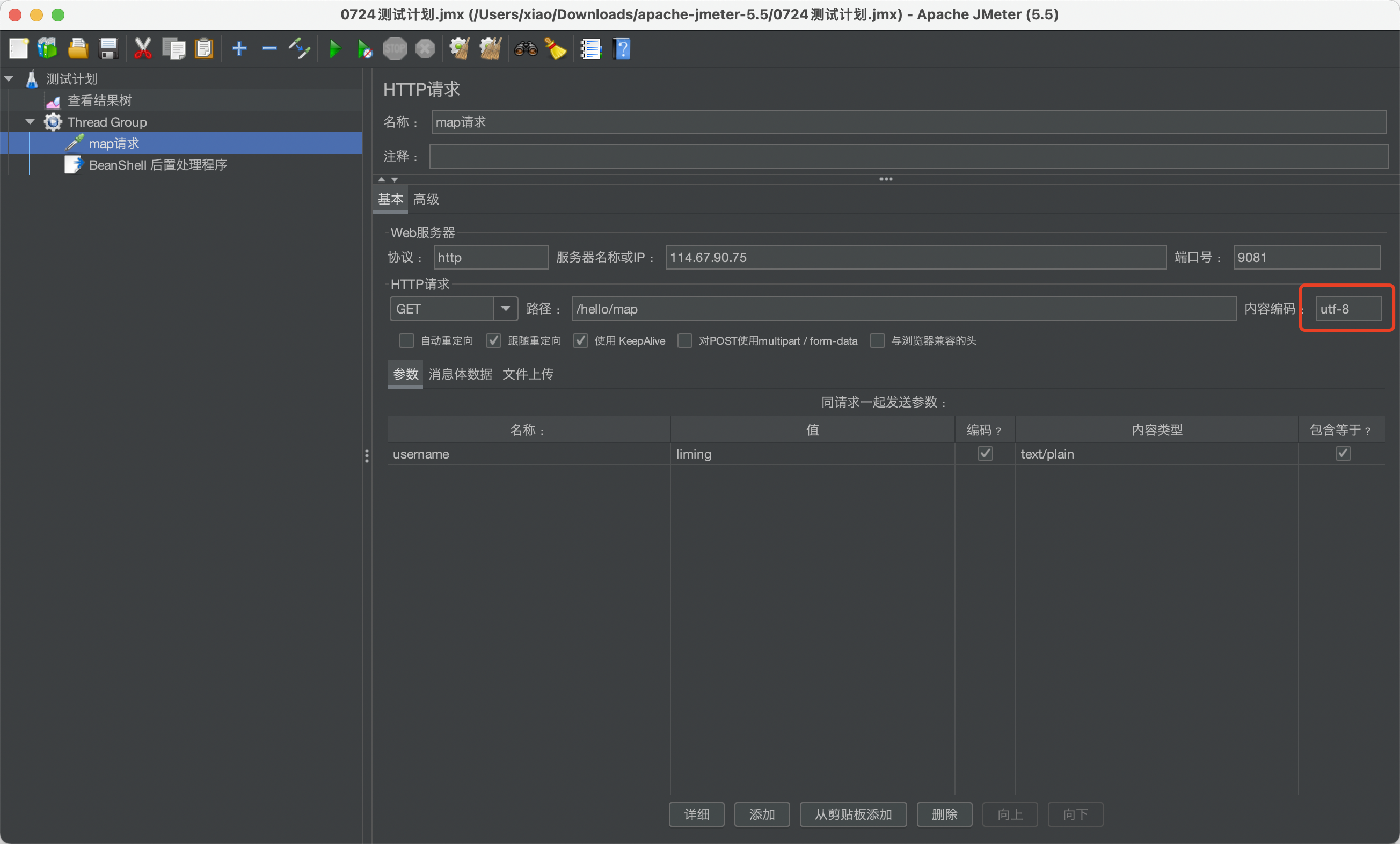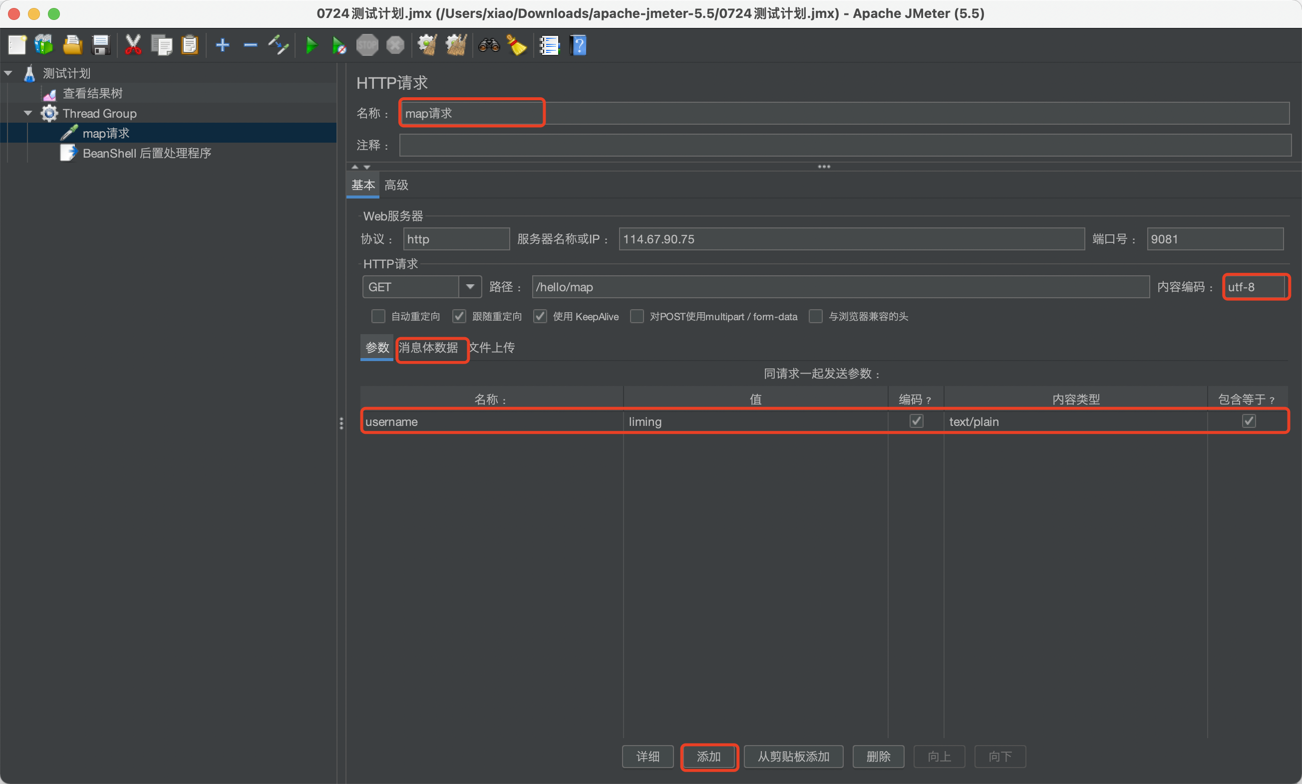 修改请求名称和请求方式,内容编码为utf-8,可添加参数或选择消息体数据