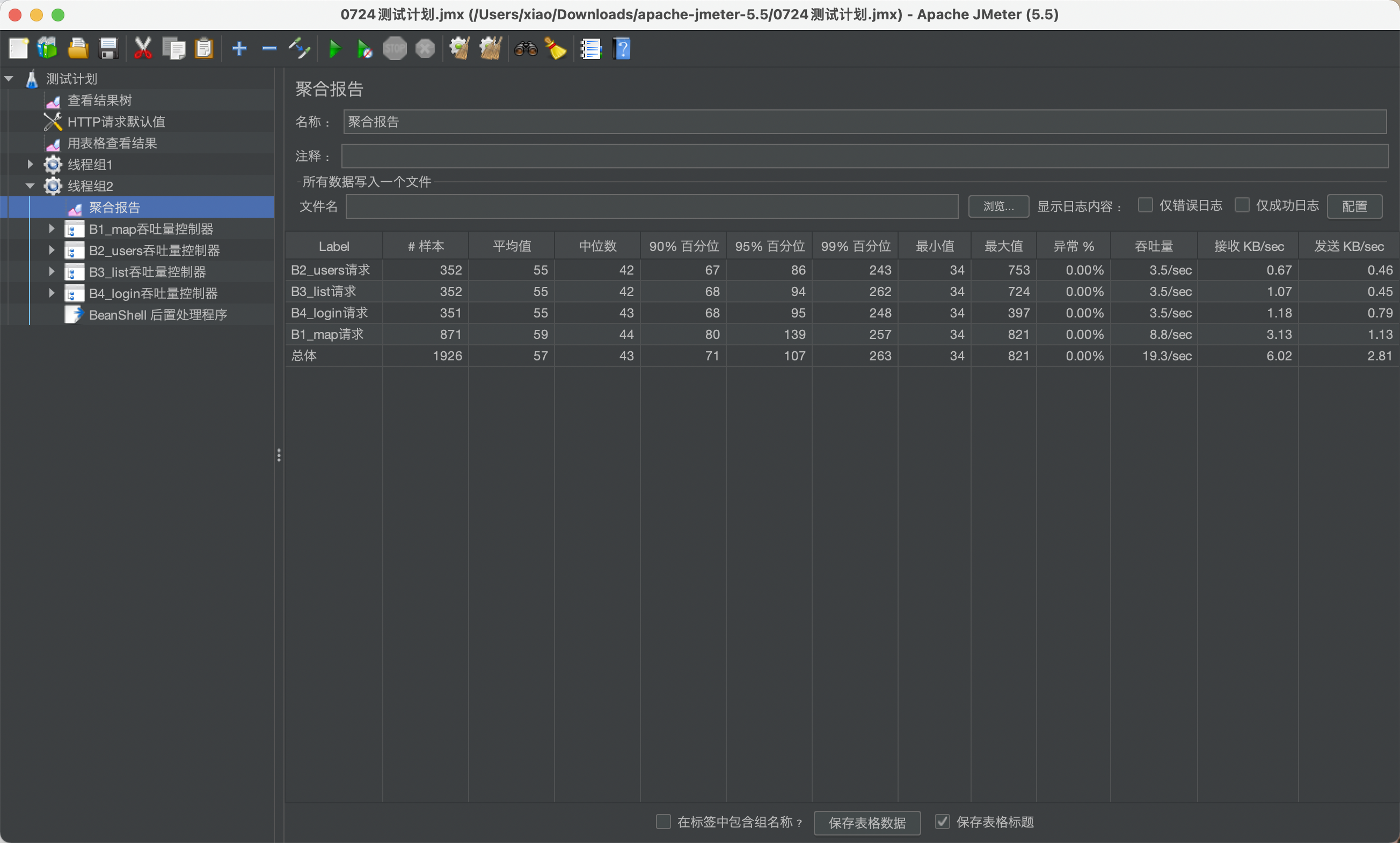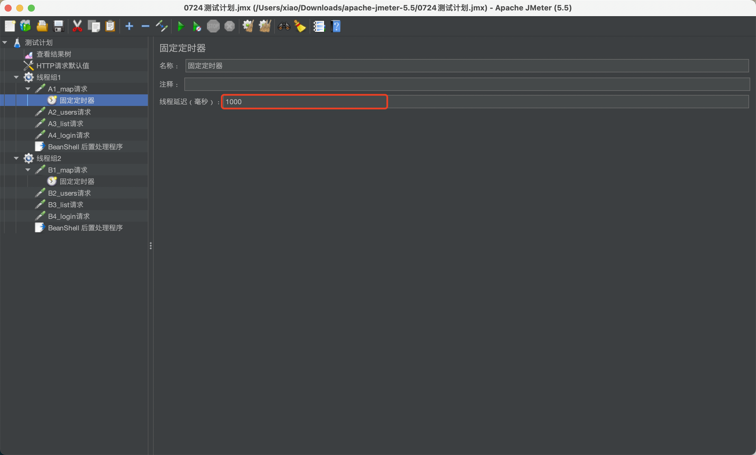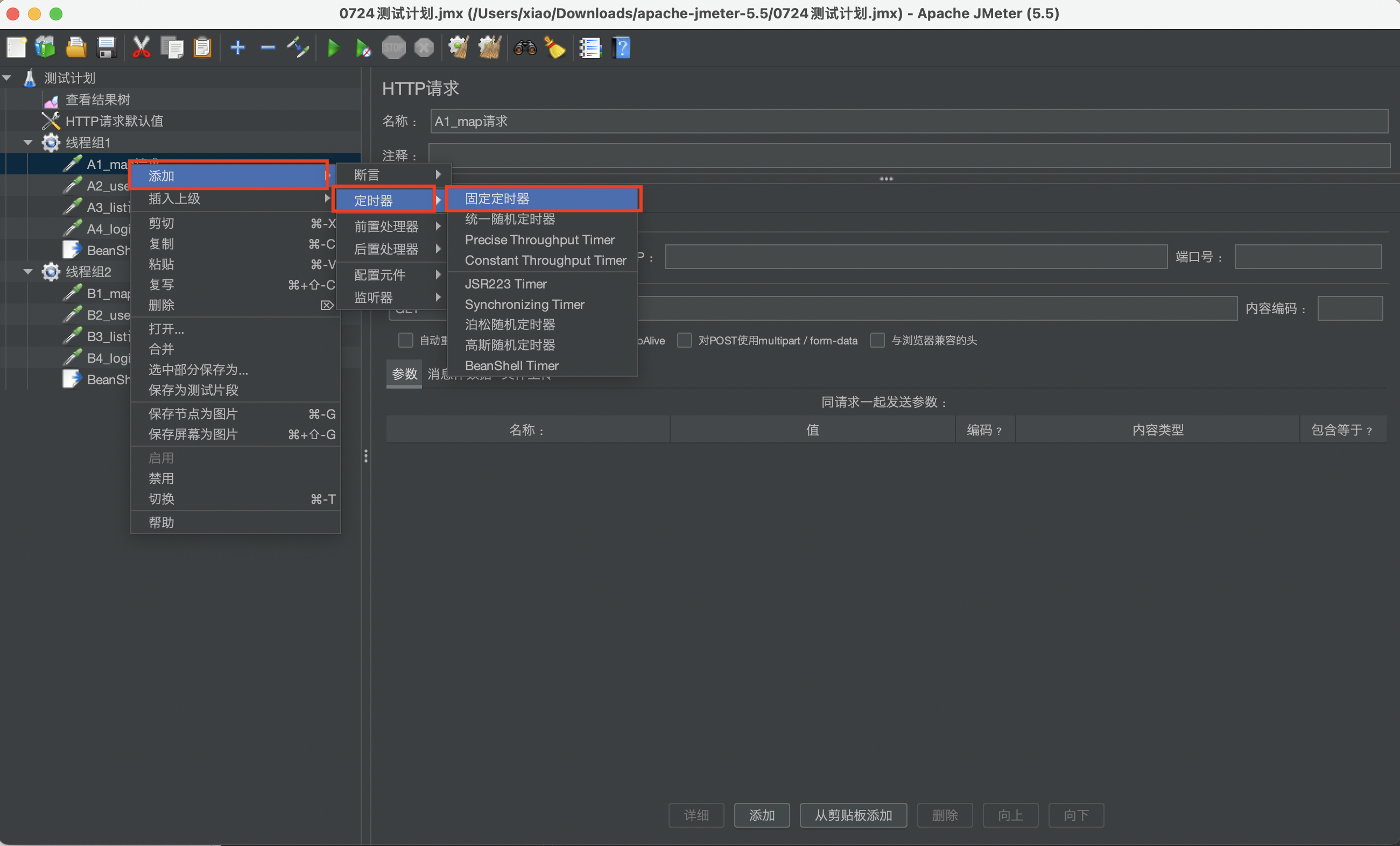 设置线程数10,永远循环,持续时间100s,map请求吞吐量50,其它users、list、login吞吐量20