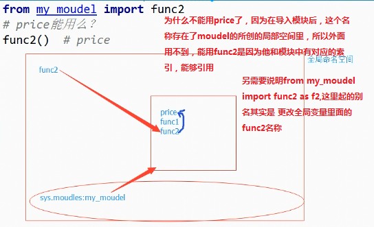 模块中的变量和全局变量会冲突吗? 下面的例子就说明 会冲突 from my_module import price print(price) #这里会打印1000 price= 2000 print(price) #这里会打印2000 my_module模块内容如下 ''' print('in my moudle') price = 1000 def func1(): print('in func1') def func2(): print('in func2') ''' #如果导入的是price 那么my_moudel这个名字还有func1都不能再使用了 from my_module import func2 #这时候price就没法用了,因为会覆盖 也就是用全局的变量,而不是模块里面的 price