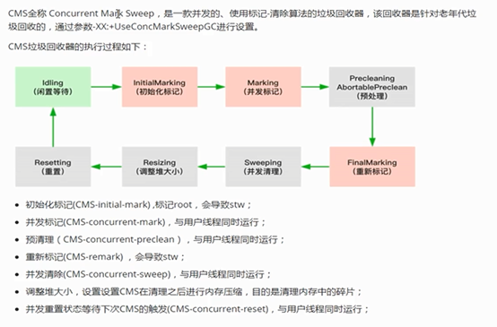 CMS垃圾收集器:全称Concurrent Mar Sweep,是一款并发的、使用标记-清除算法的垃圾收集器,该收集器是针对老年代垃圾回收的。