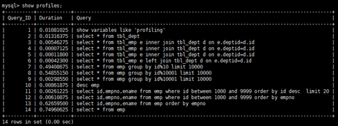 show profile cpu,block io for query query_id; query_id为show profiles中查询到的query_id那一列的值,比如: