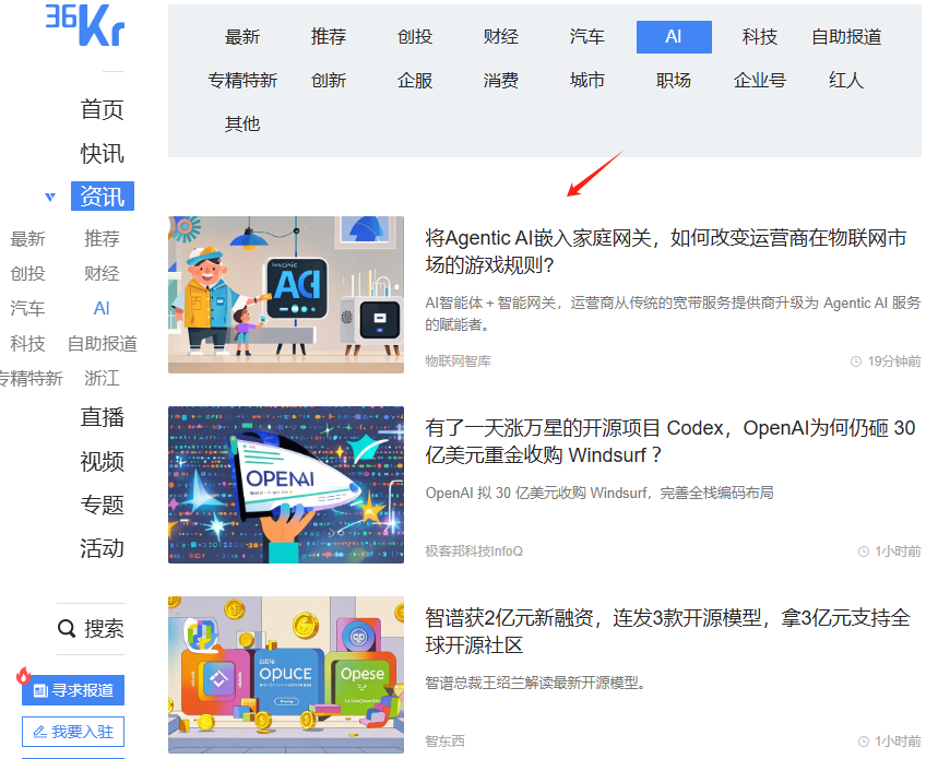 这里以36氪为例子,打开网页:https://36kr.com/information/AI/
