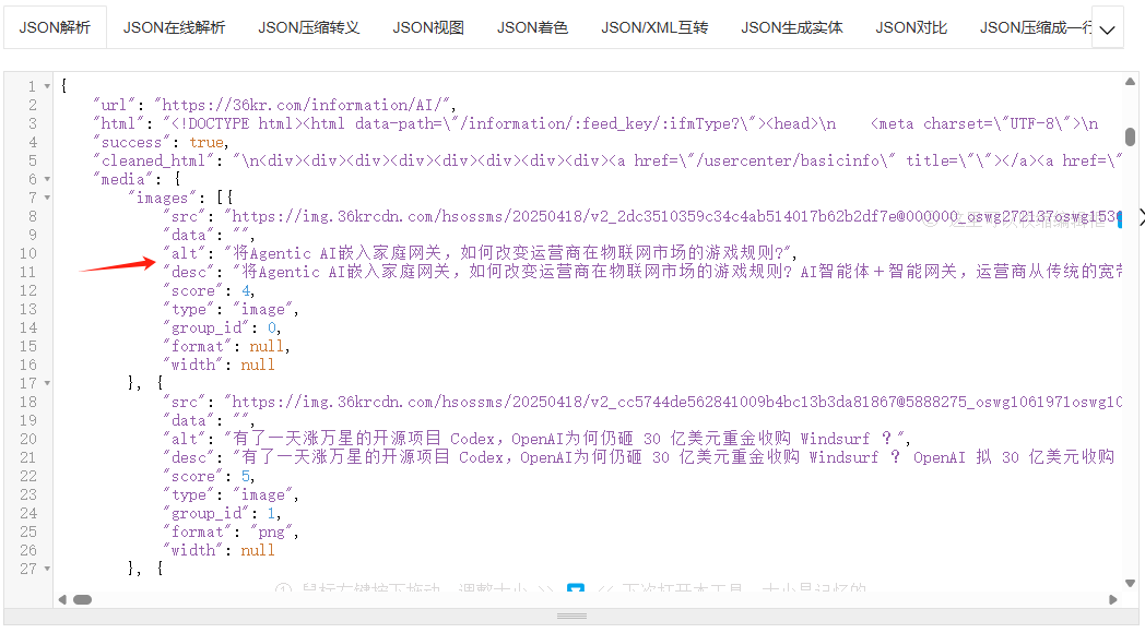 可以看到json的内容j结构体,其中alt字段就是文章标题。