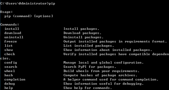 输入pip回车,返回pip使用说明,证明pip环境变量配置正确
