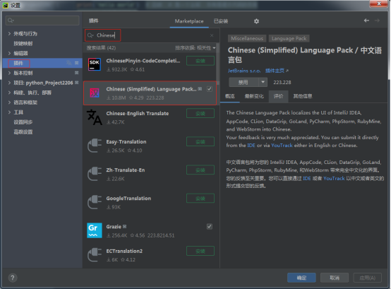 安装中文插件:文件--设置--插件--输入Chinese--安装