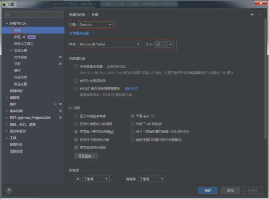 设置字体:文件--设置--外观与行为--外观,设置主题及字体大小