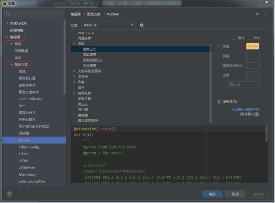 设置编辑器字体颜色:文件--设置--编辑器--配色方案--Python