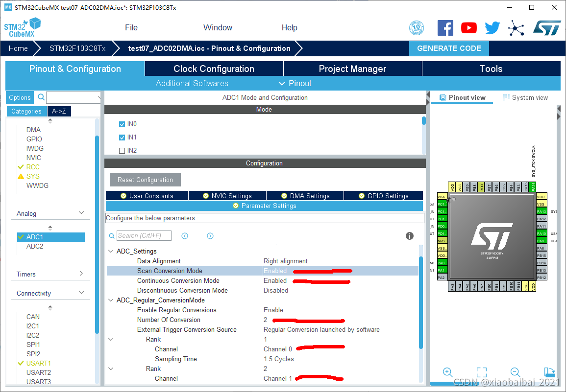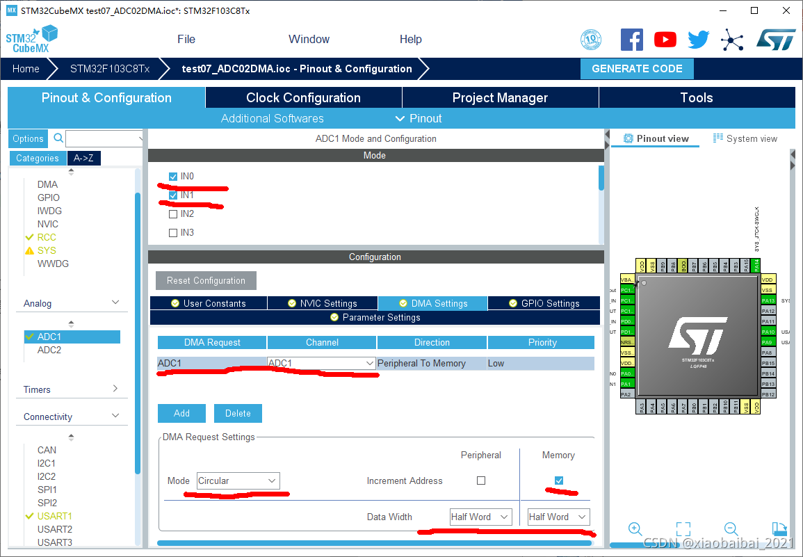 如下图,选择IN0和IN1两个通道,并启用DMA循环模式: